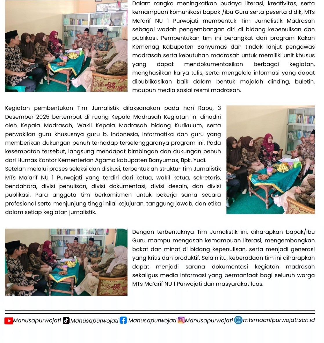 Pengawas Madrasah Ibu Siti Muflikhah, S.Ag., M.Pd. Resmikan Pembentukan Tim Jurnalistik di MTs Ma’arif NU 1 PurwojatiOleh admin MTs Ma'arif NU 1 Purwojati / 6 Desember 2025